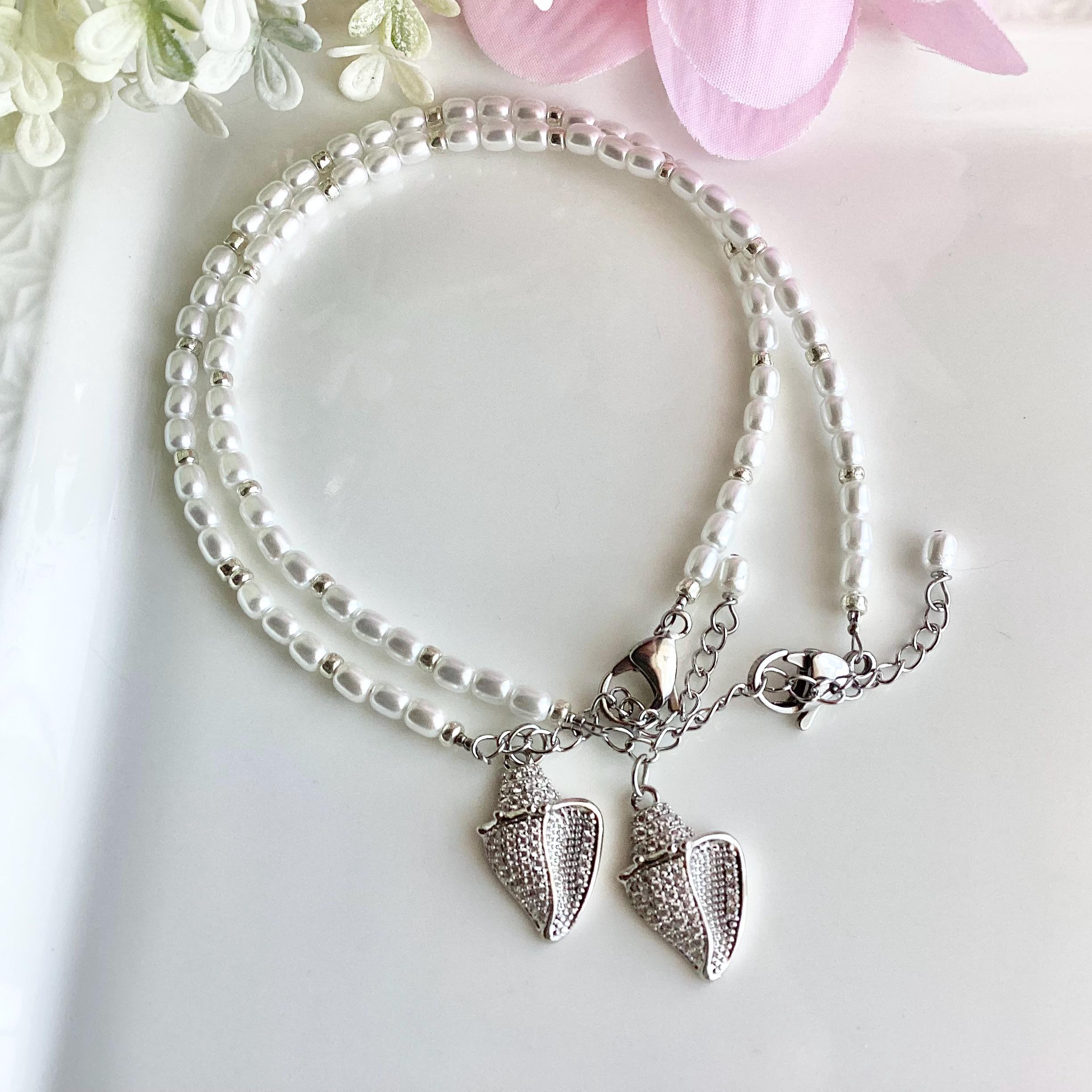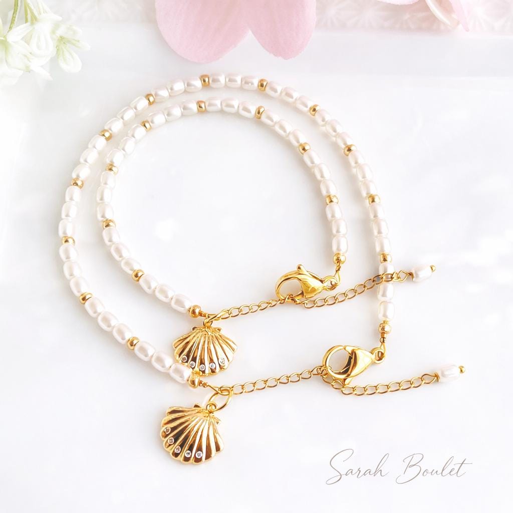 Bracelet cheville perle argent avec coquillages