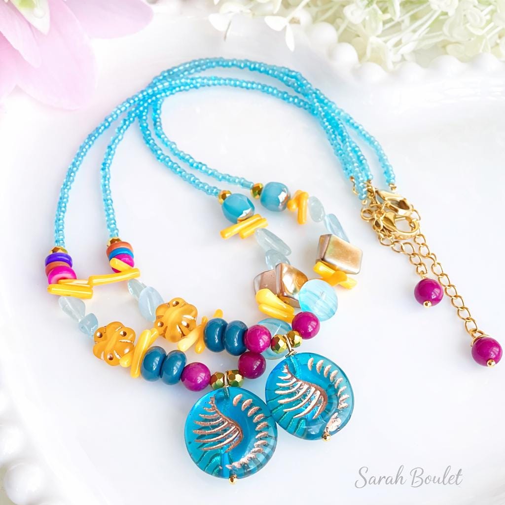 Des colliers délicats aux teintes bleu profond rappelant les eaux calmes, aux bracelets lumineux aux reflets turquoise et magenta, chaque pièce évoque un fragment de récif, un éclat de lumière sous l’eau, un souvenir d’été au bord de la mer… 🐚✨