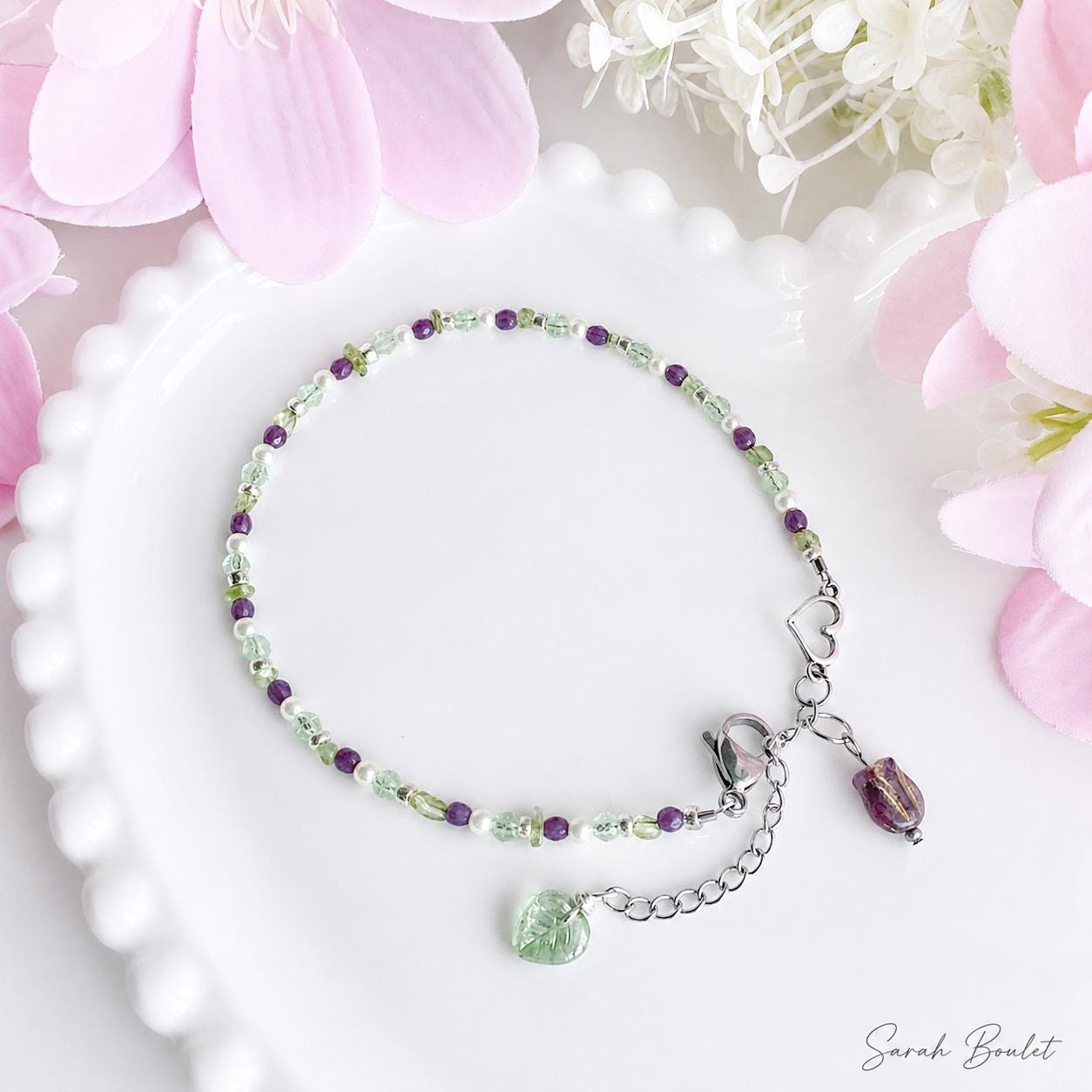 Améthyste, jade canadien et péridote s’unissent pour créer des bijoux apaisants, élégants et uniques. Chaque pièce est faite à la main avec des perles de verre de grande qualité 💫
