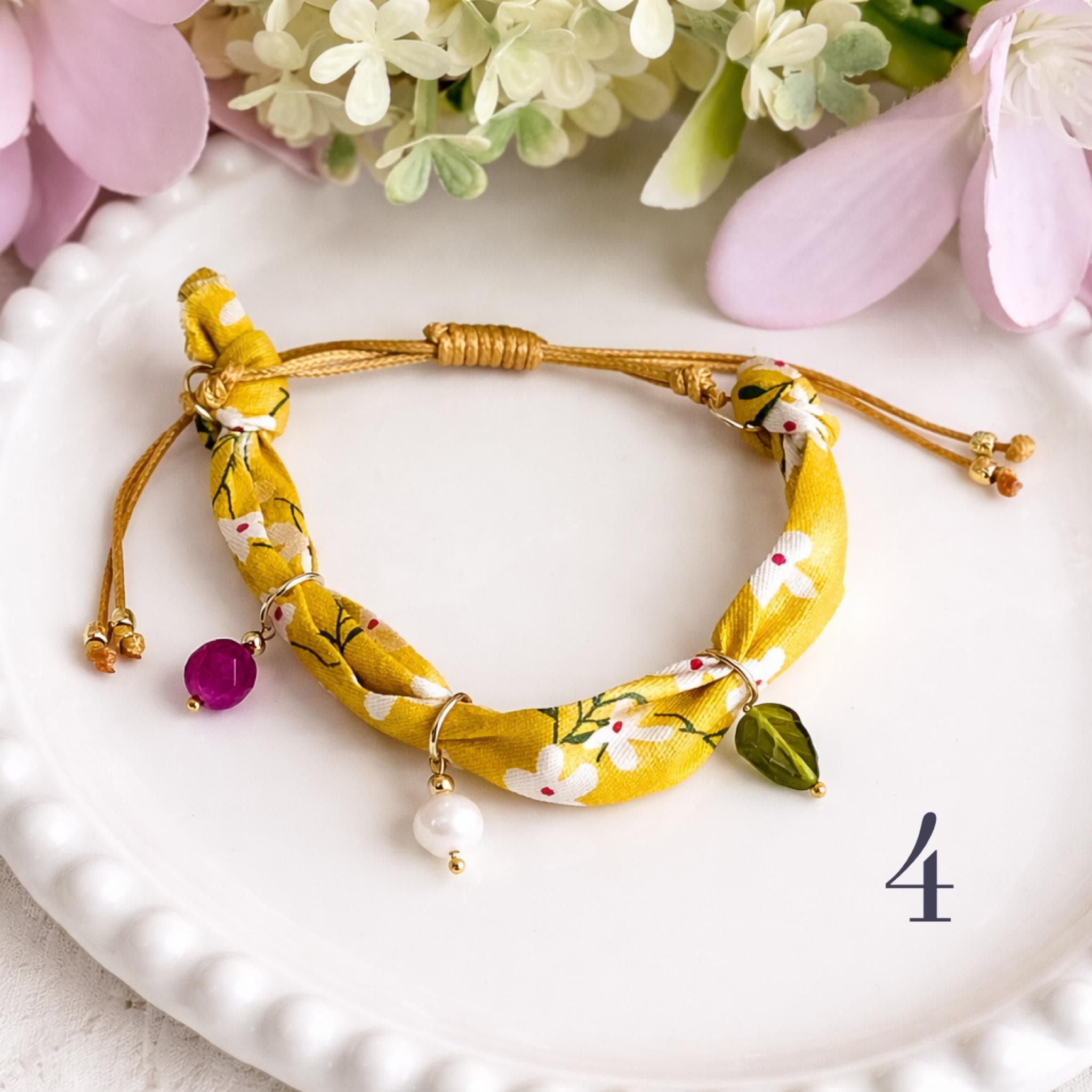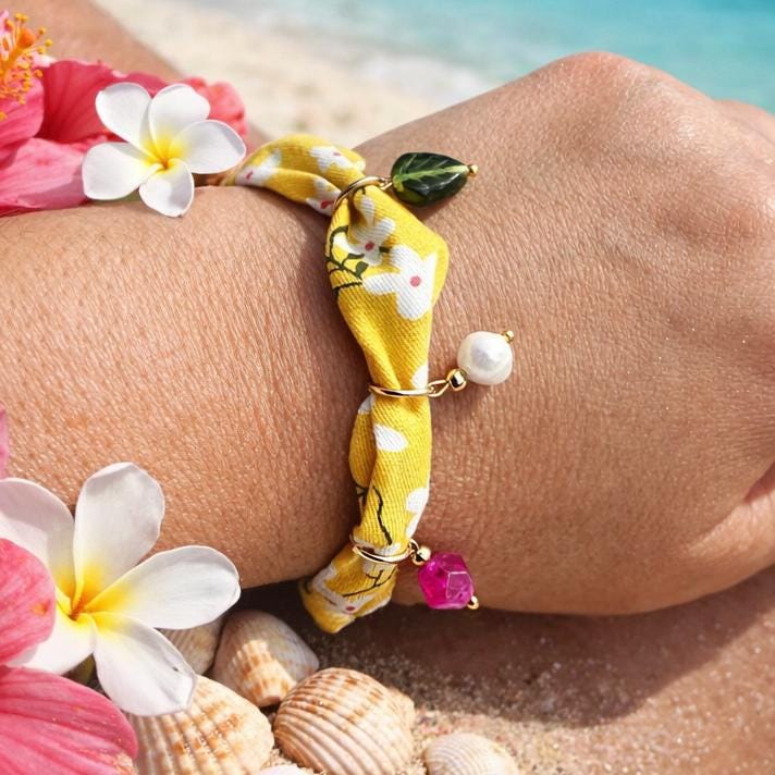 Bracelet bandana ajustable jaune fleuri – Bracelet bohème chic été – Bijou vacances plage – Cadeau femme
