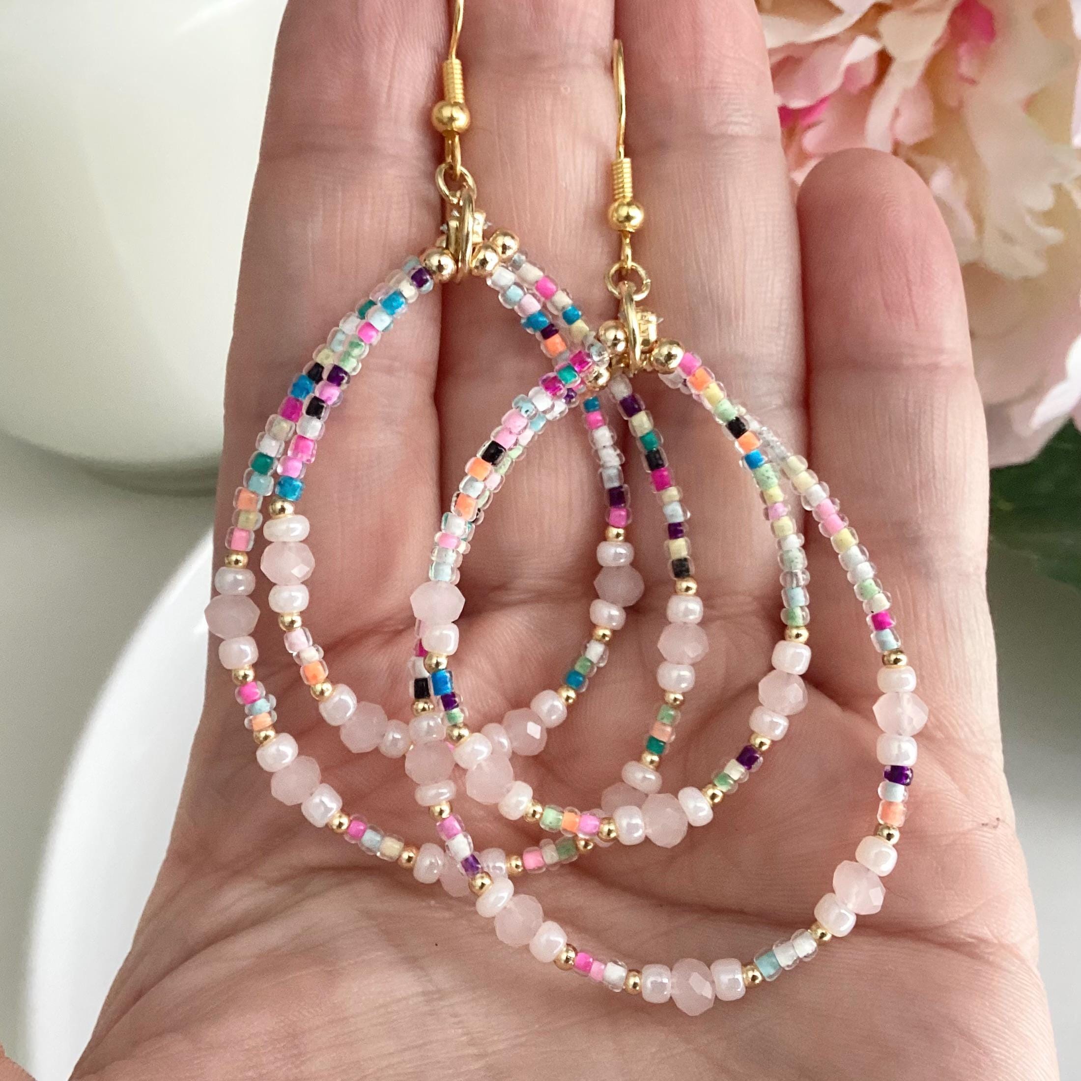 Boucles d’oreilles pour femme « Douce Intuition », en perles de cristal rose et perles multicolores lumineuses.