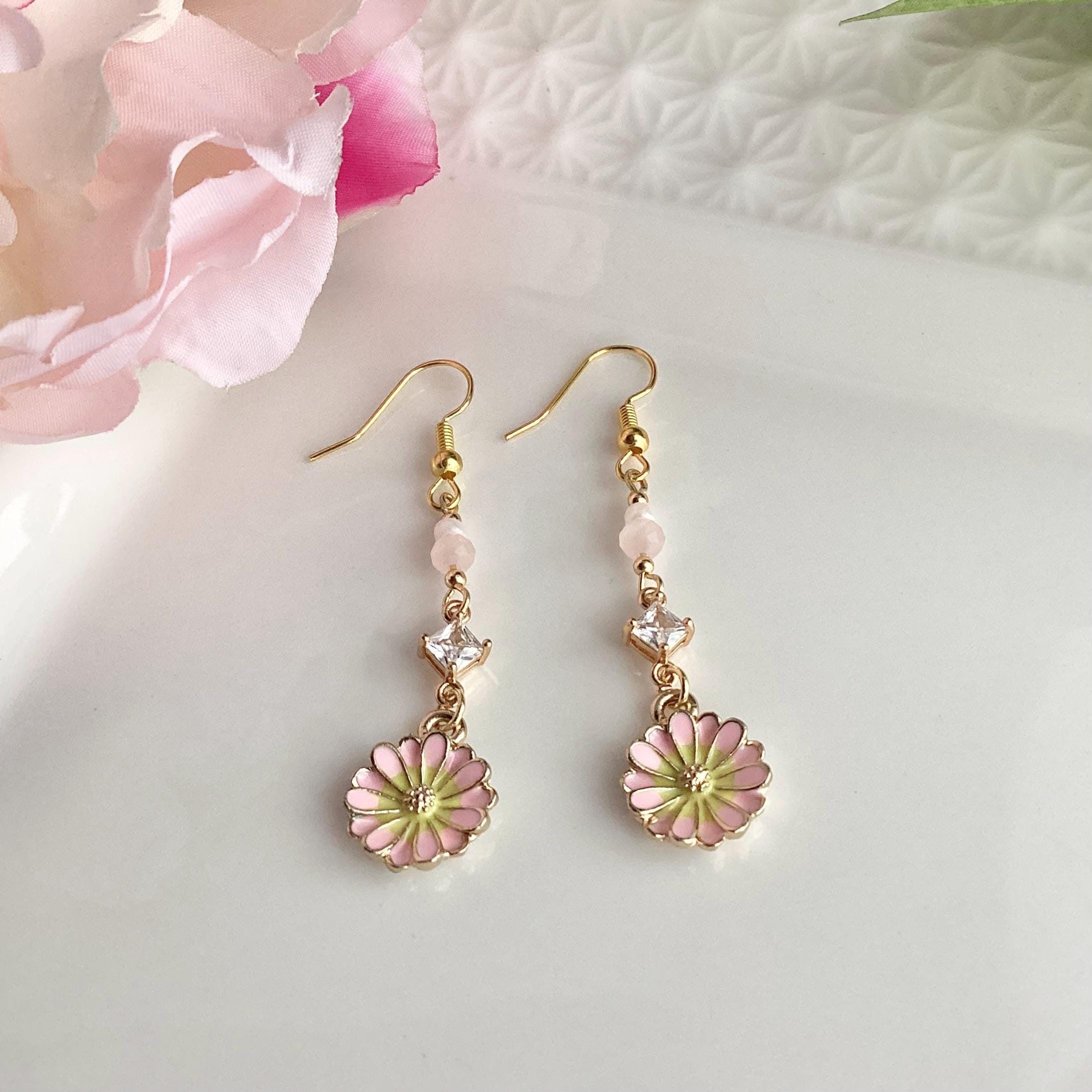 Boucles d’oreilles fleurs roses en acier inoxydable avec cascade de perles