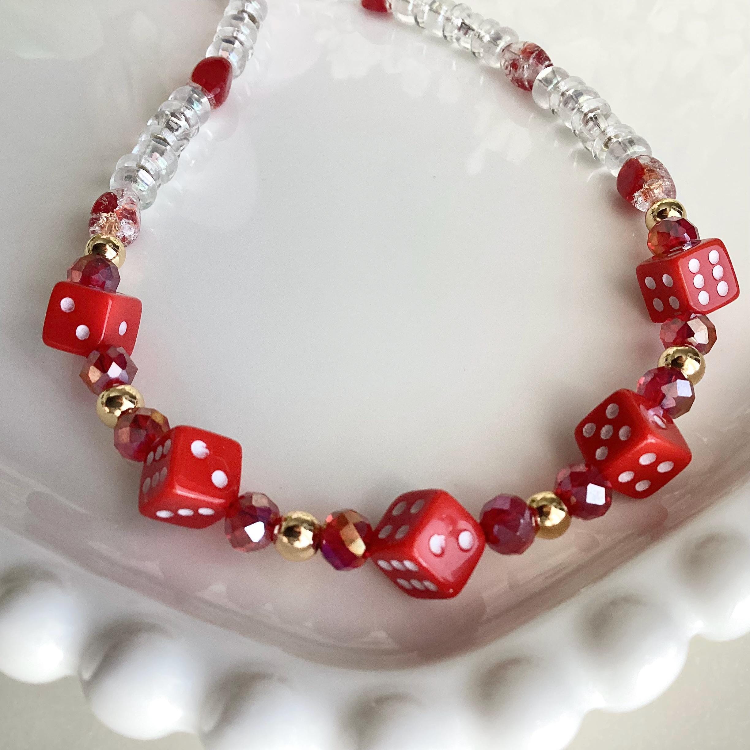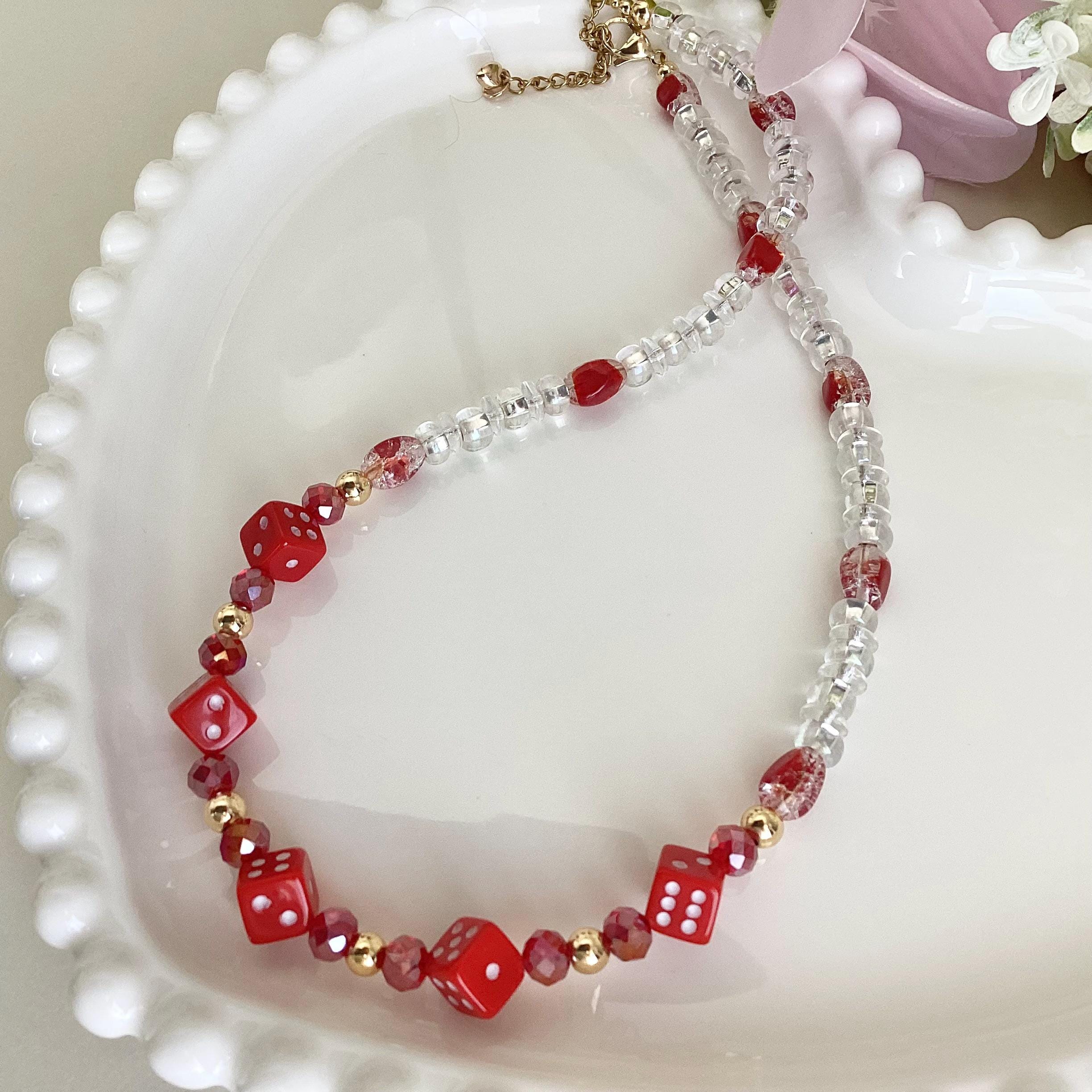 un collier breloque avec perles en cristal de verre, et de dés de jeu.