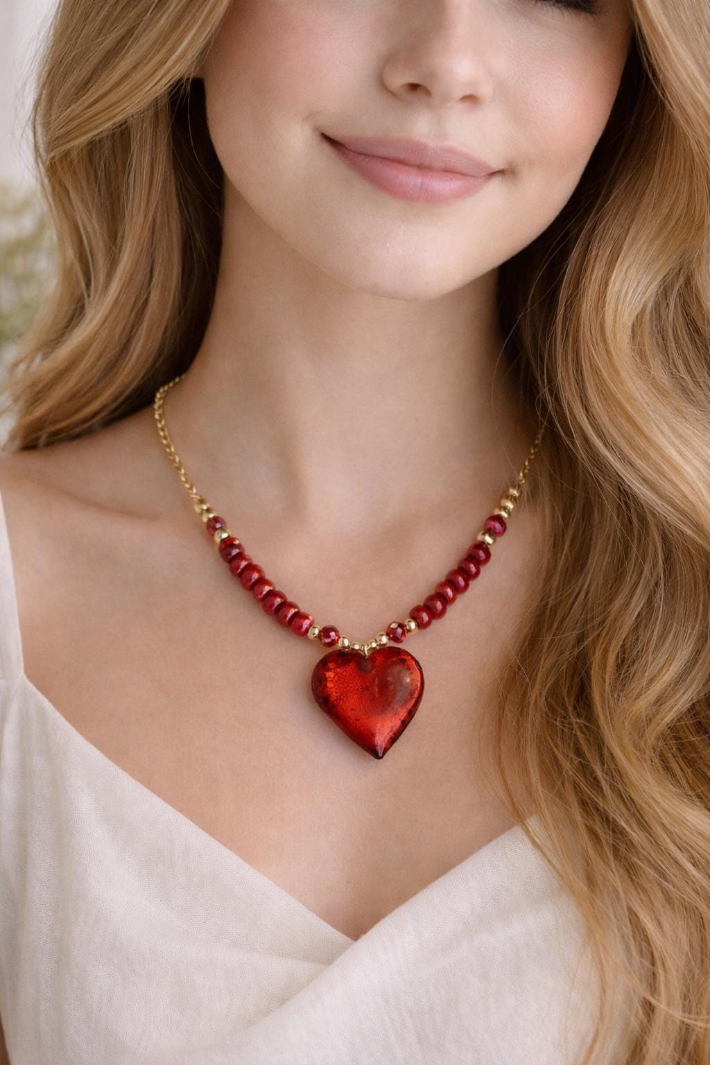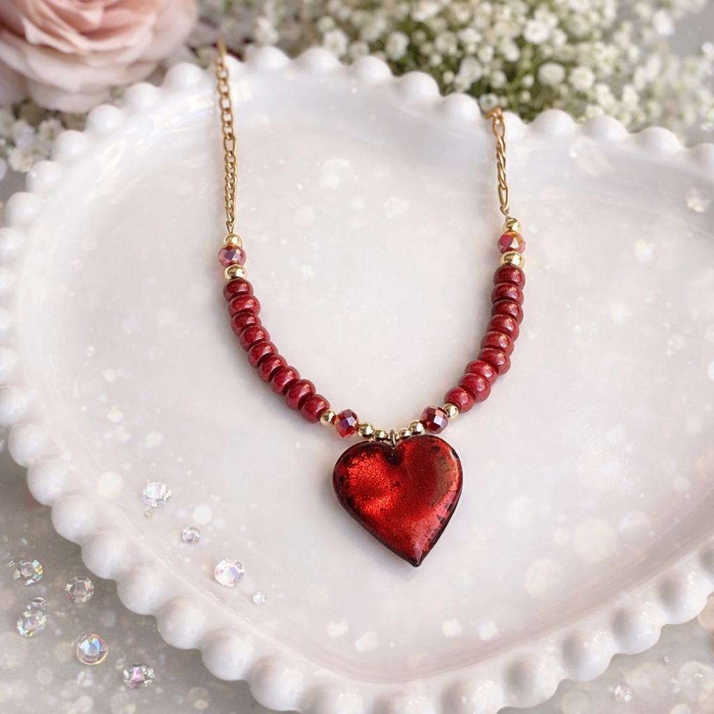 Voici une collection Saint-Valentin composée d’un collier cœur façon sucre d’orge, accompagné de perles rouges aux allures de cœurs à la cannelle, qui vous fera fondre de bonheur.