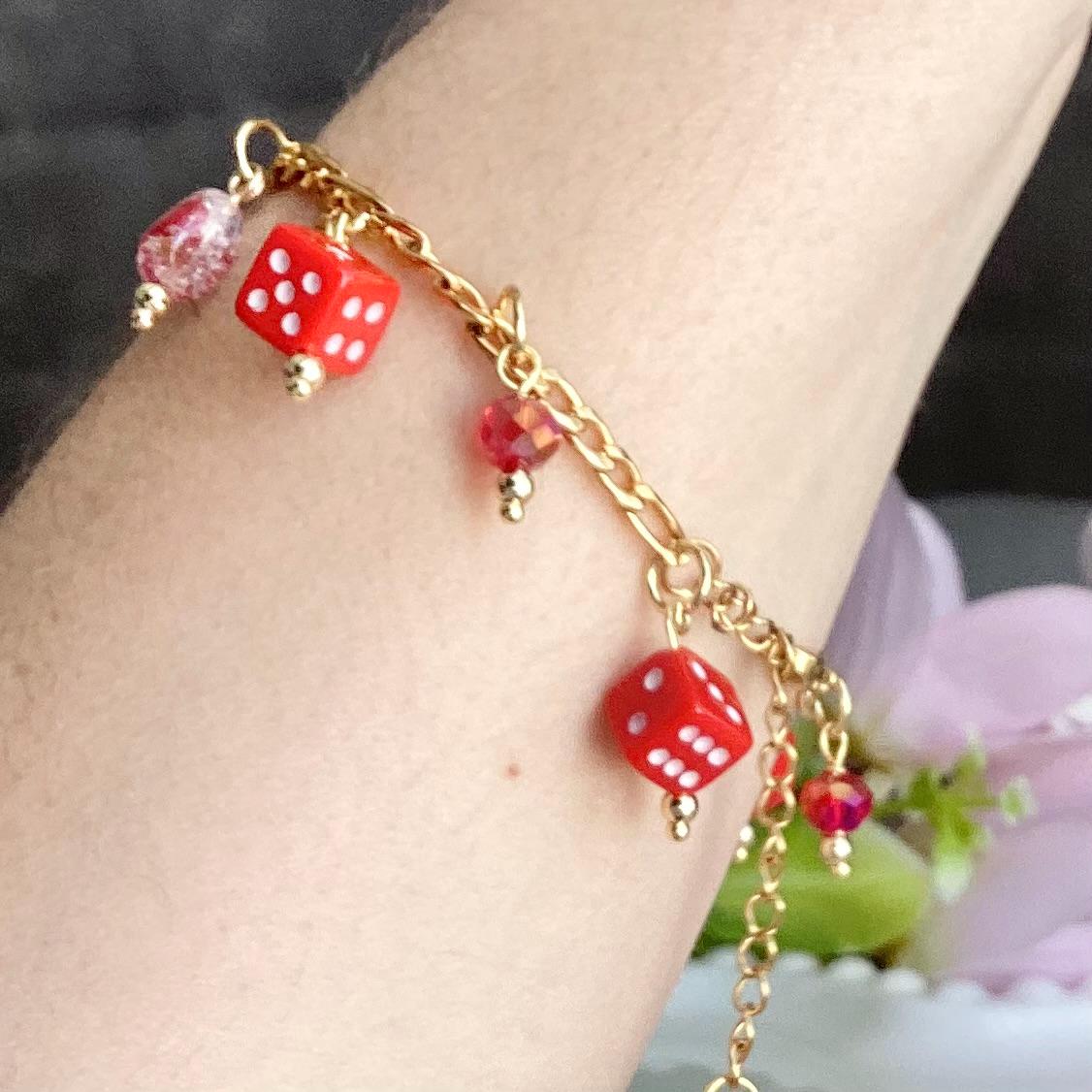 Avec un bracelet à breloques totalisant 5 dés de jeu et breloques,
