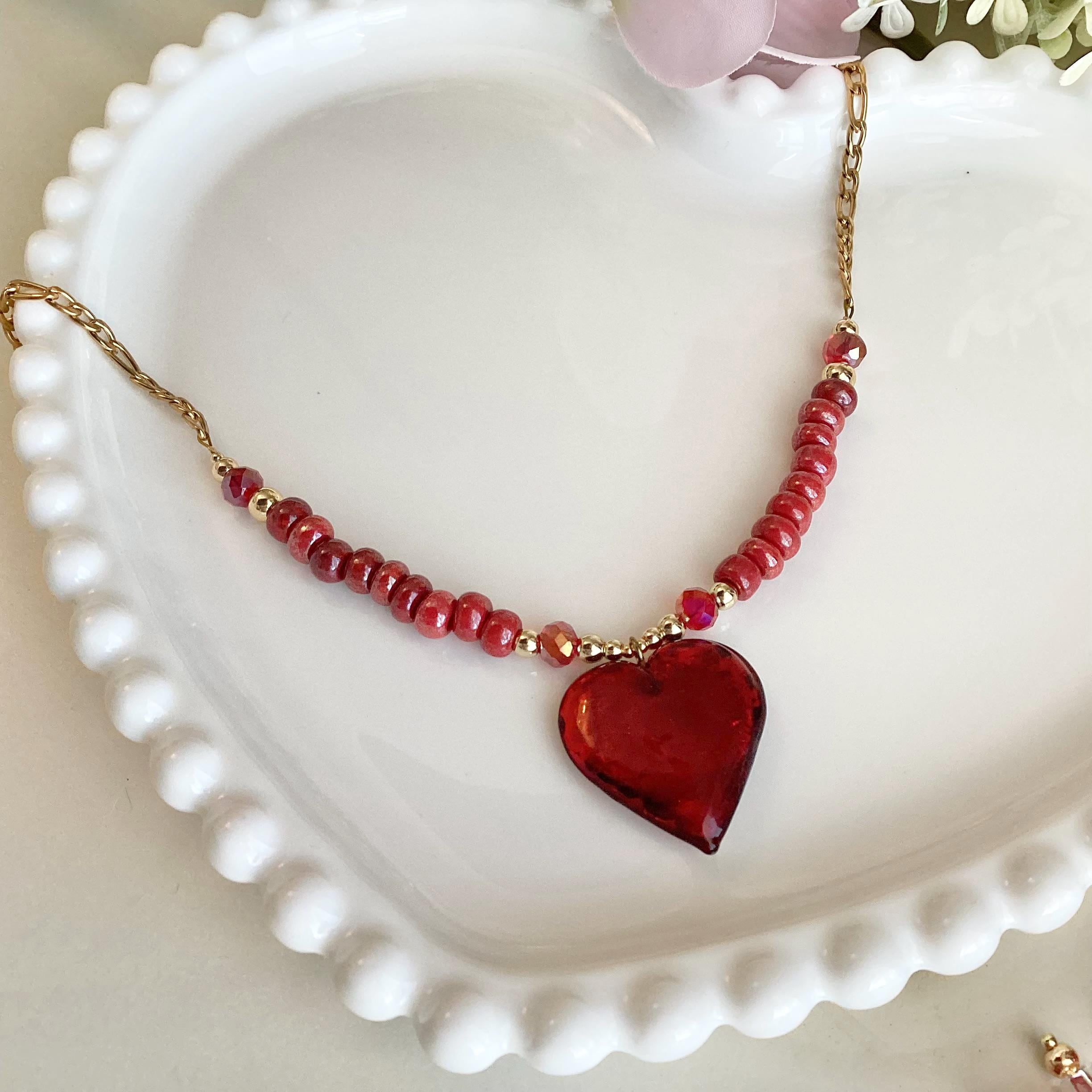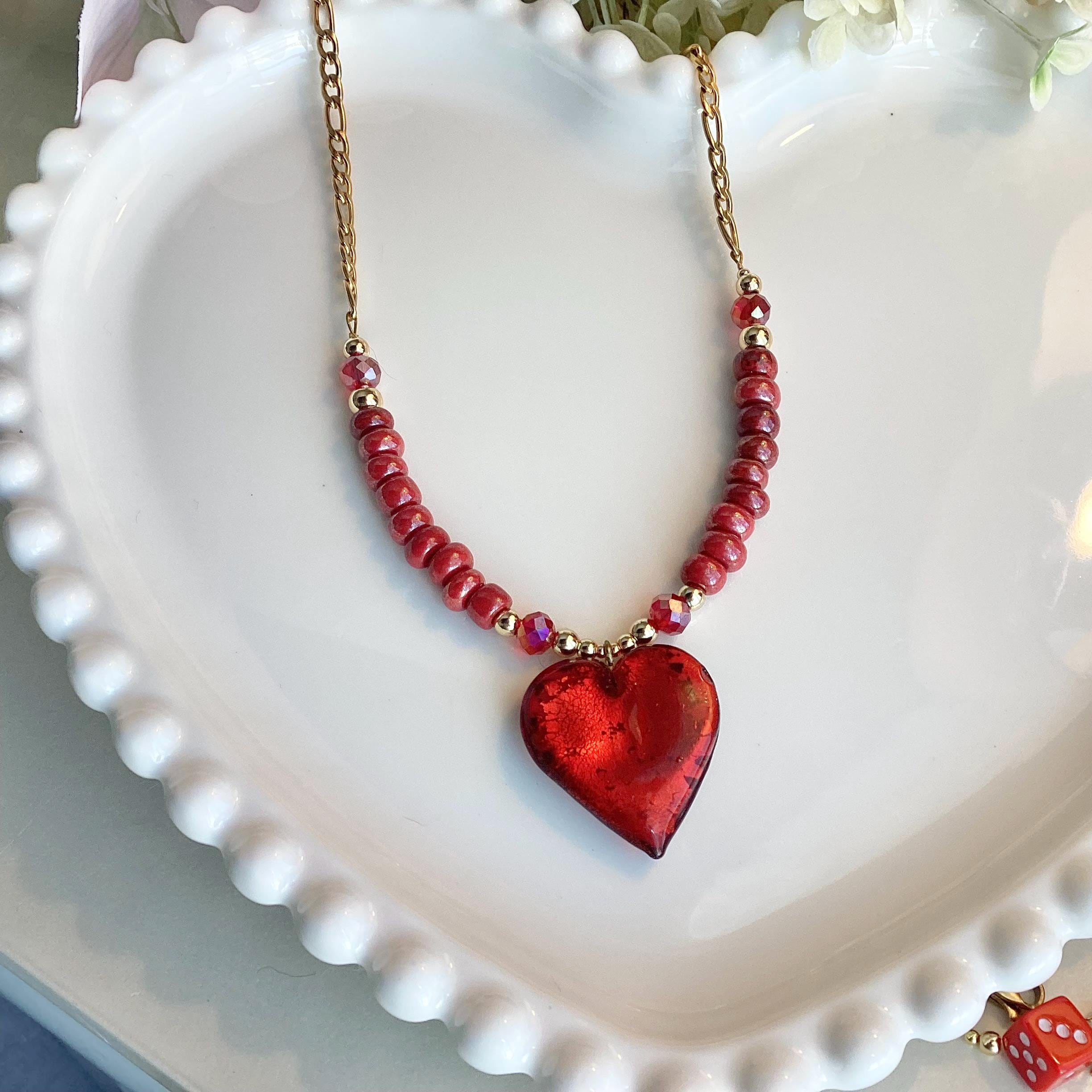 collier cœur façon sucre d’orge, accompagné de perles rouges aux allures de cœurs à la cannelle, qui vous fera fondre de bonheur.