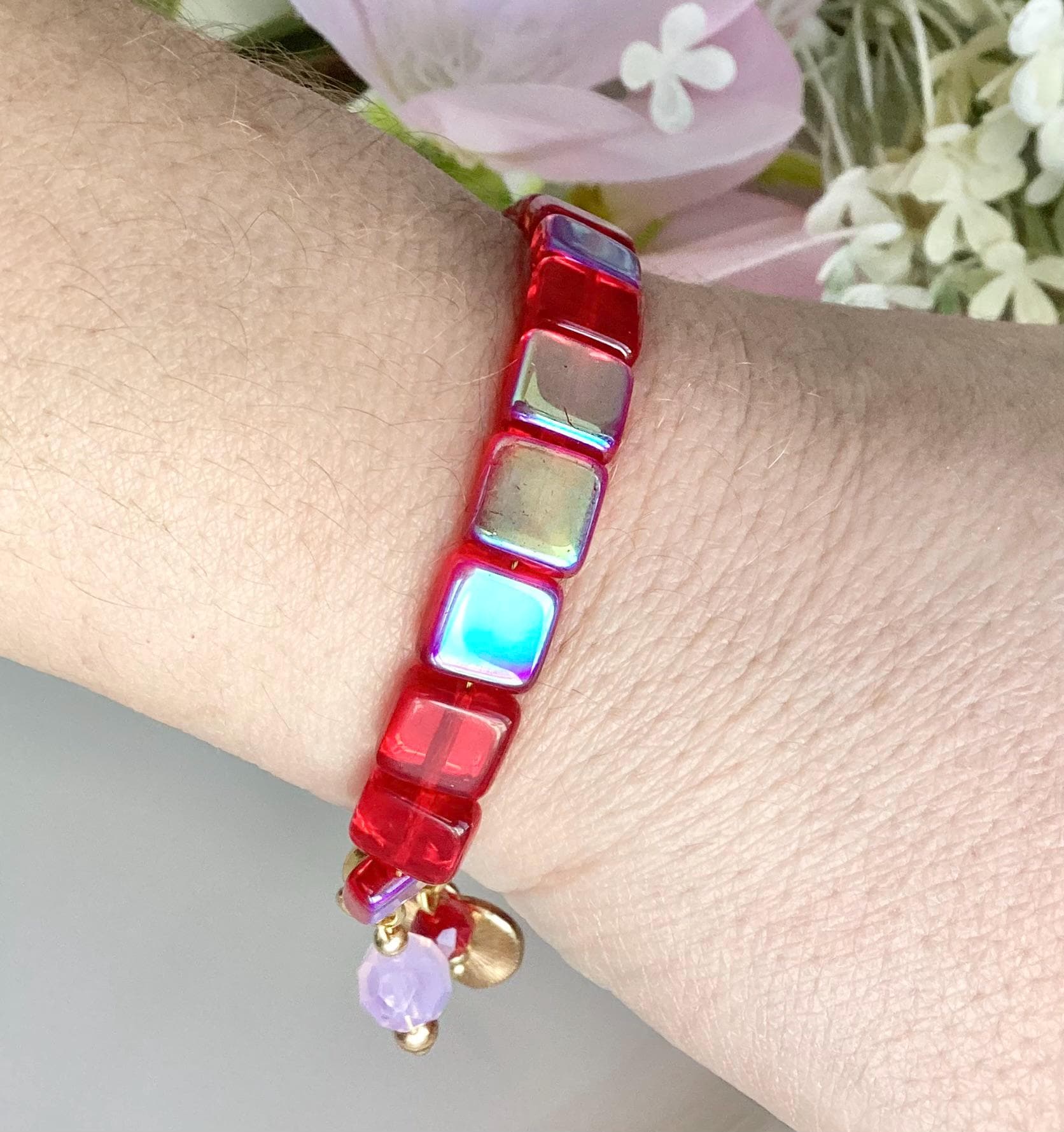 J’ai accompagné ce bijou d’un bracelet avec des perles en forme de carrés rouges AB brillants.