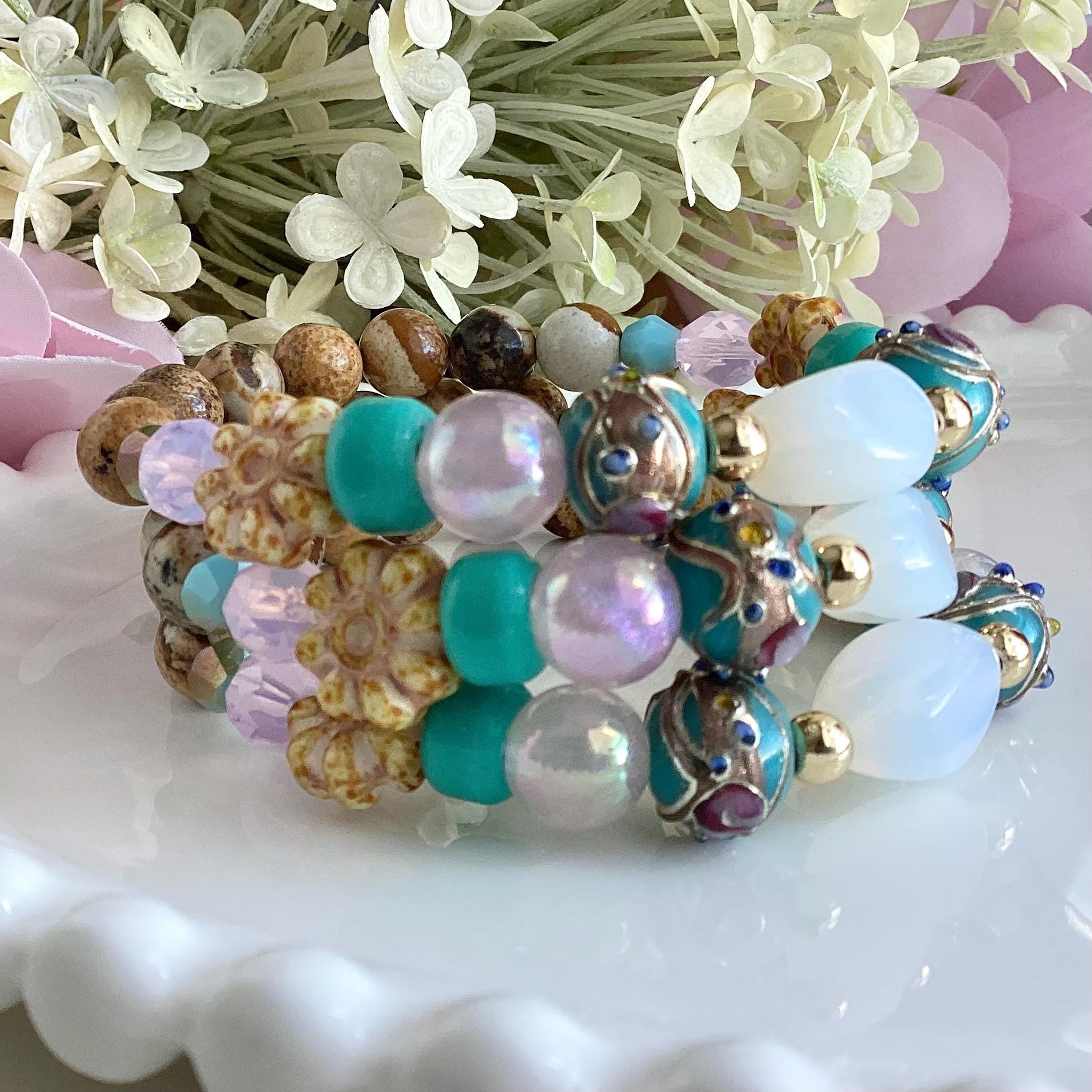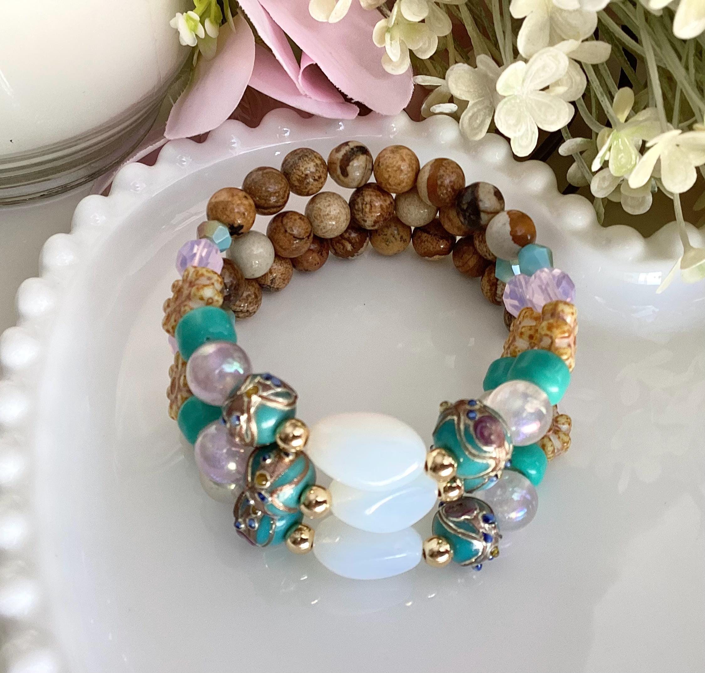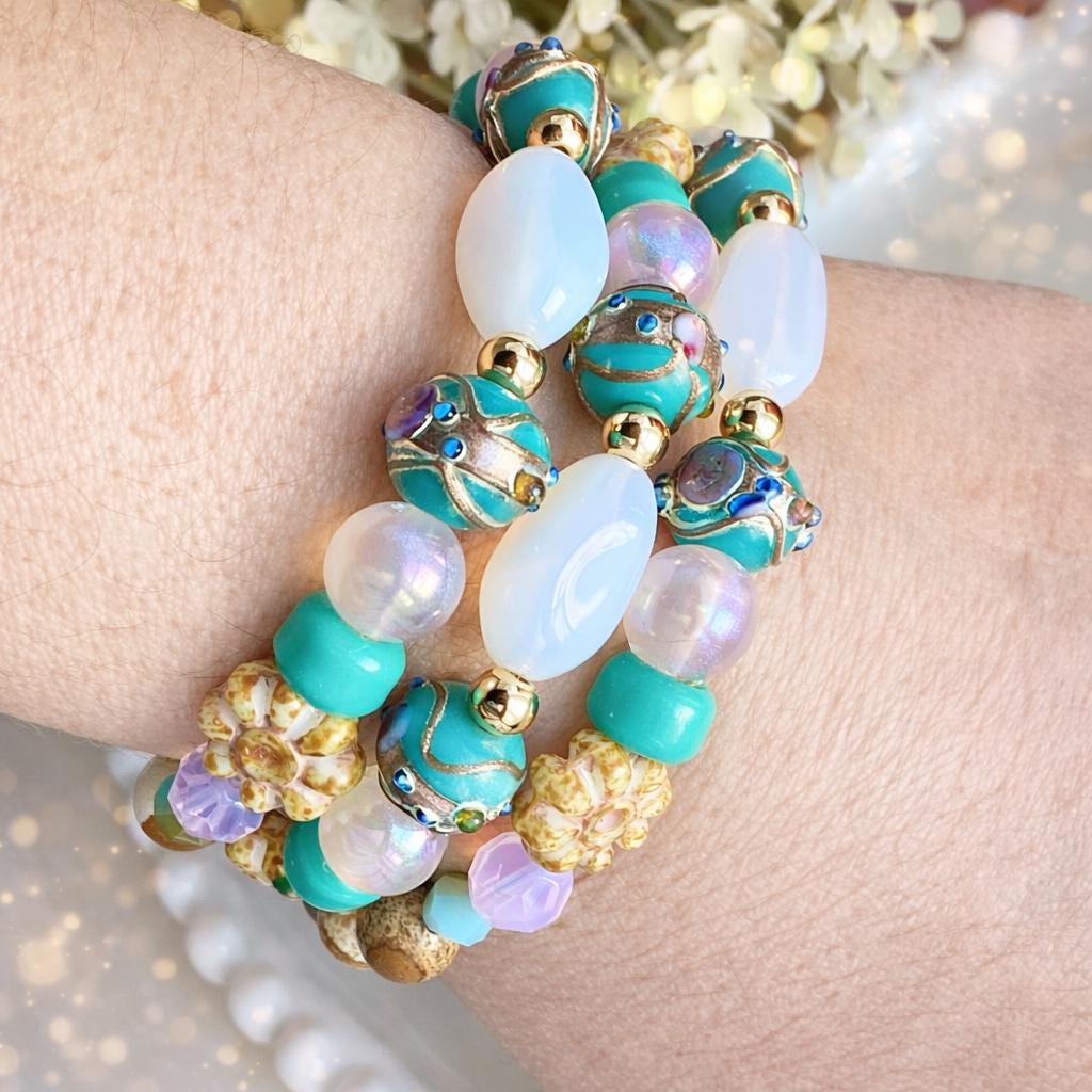 Bracelet, turquoise lumineux, rose délicat et jaune moutarde