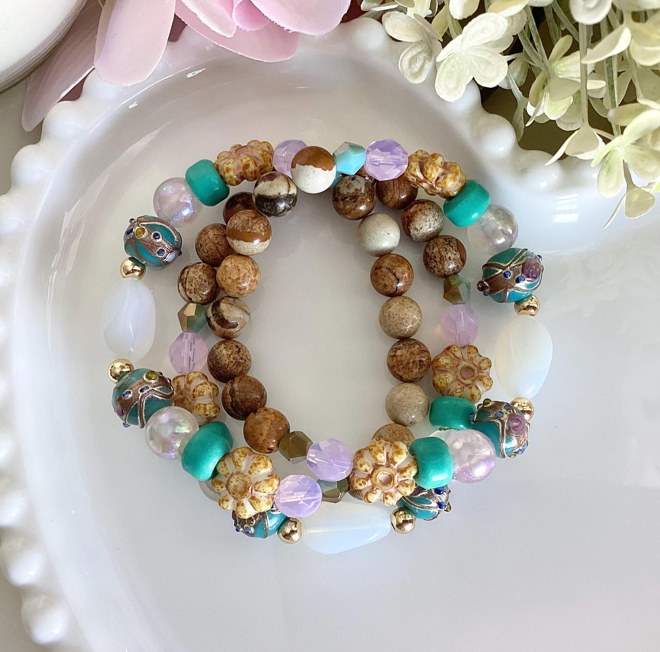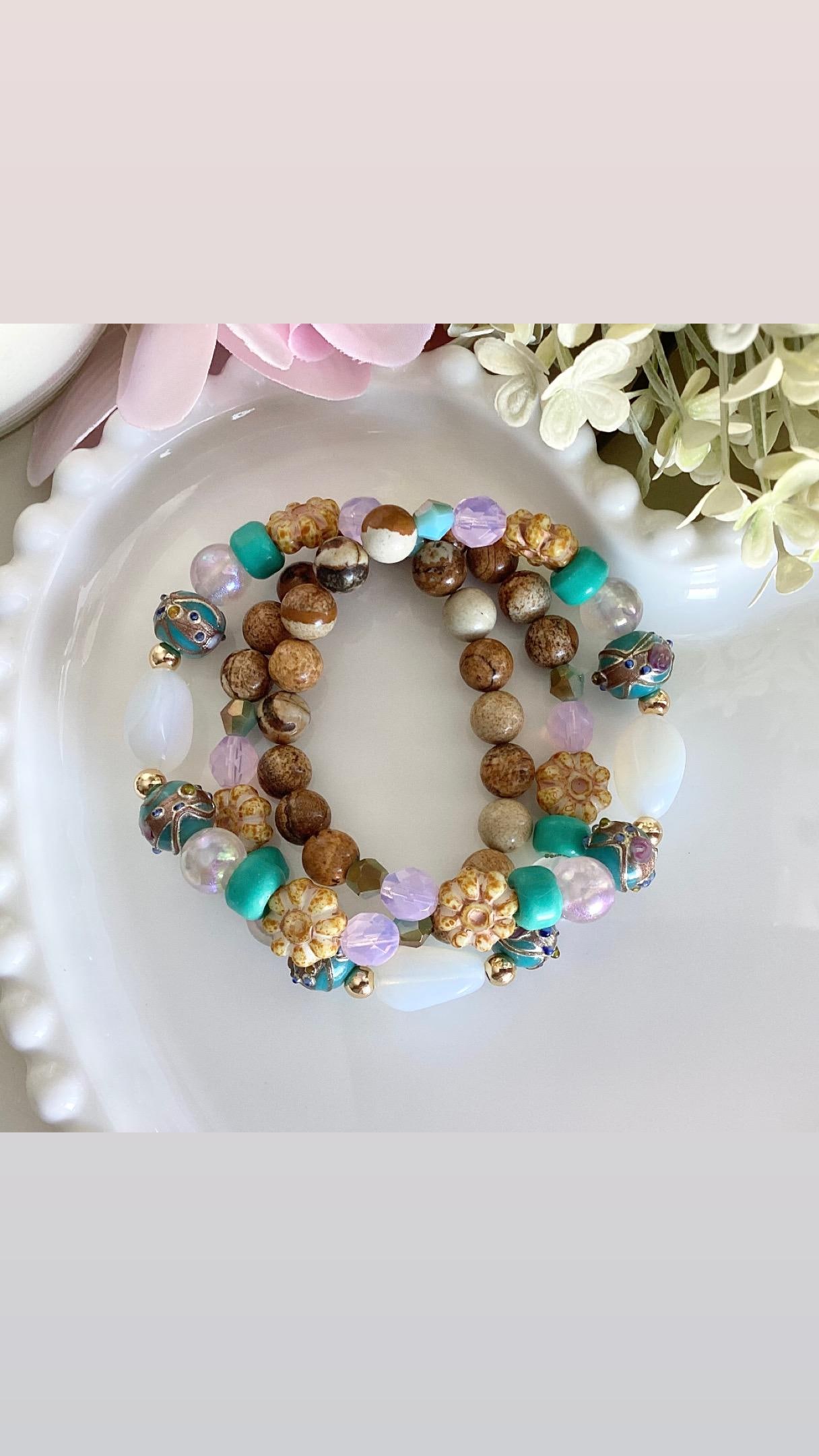 Cette mini-collection met à l’honneur des tons chaleureux et naturels : collier, bracelet, boucles oreilles turquoise lumineux, rose délicat et jaune moutarde, harmonieusement associés à des perles soigneusement sélectionnées.