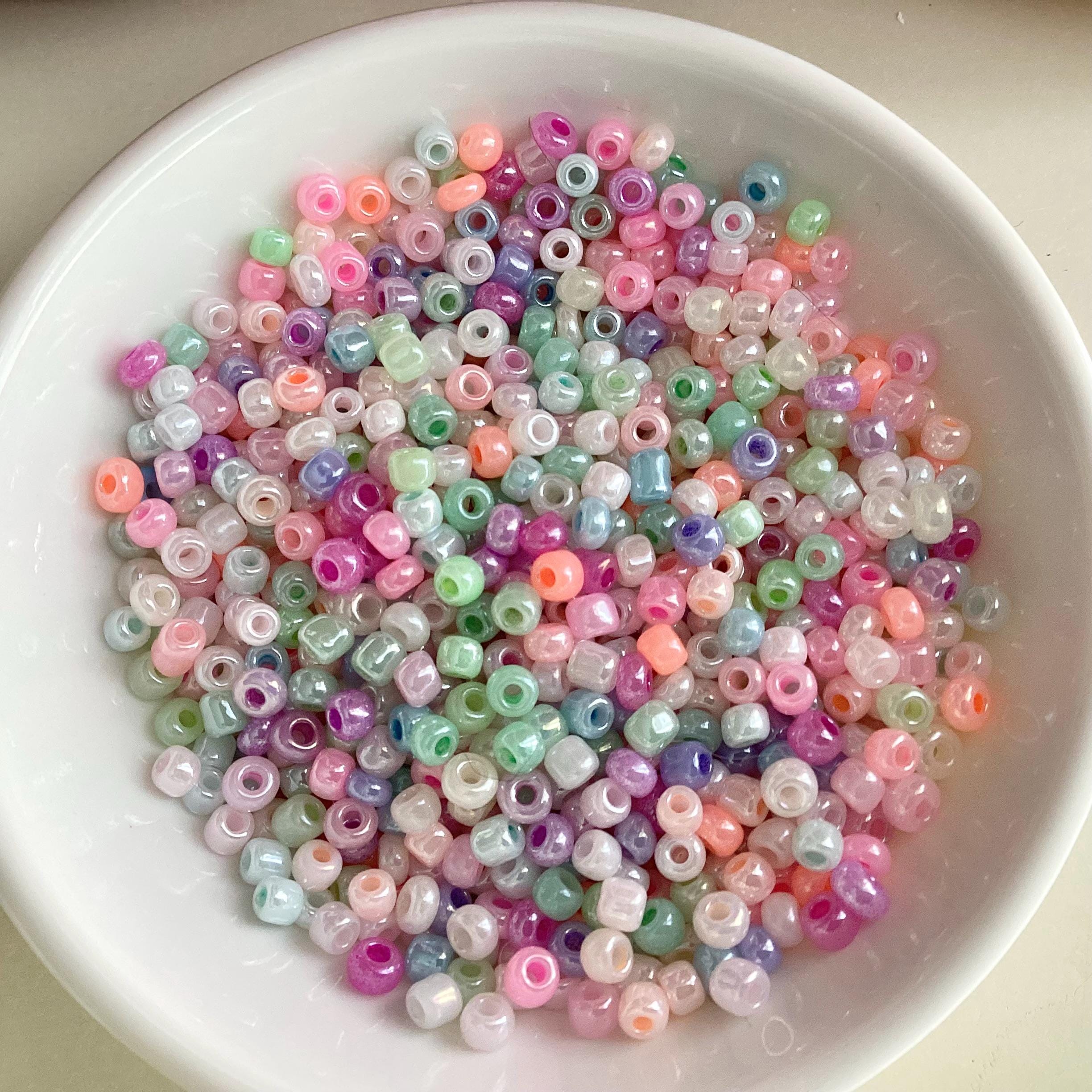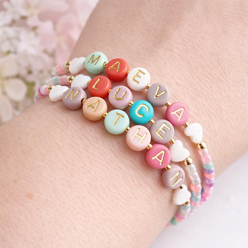 Chaque bracelet est monte a la main, perle par perle, avec des teintes pastel lumineuses et des lettres dorees delicates.
