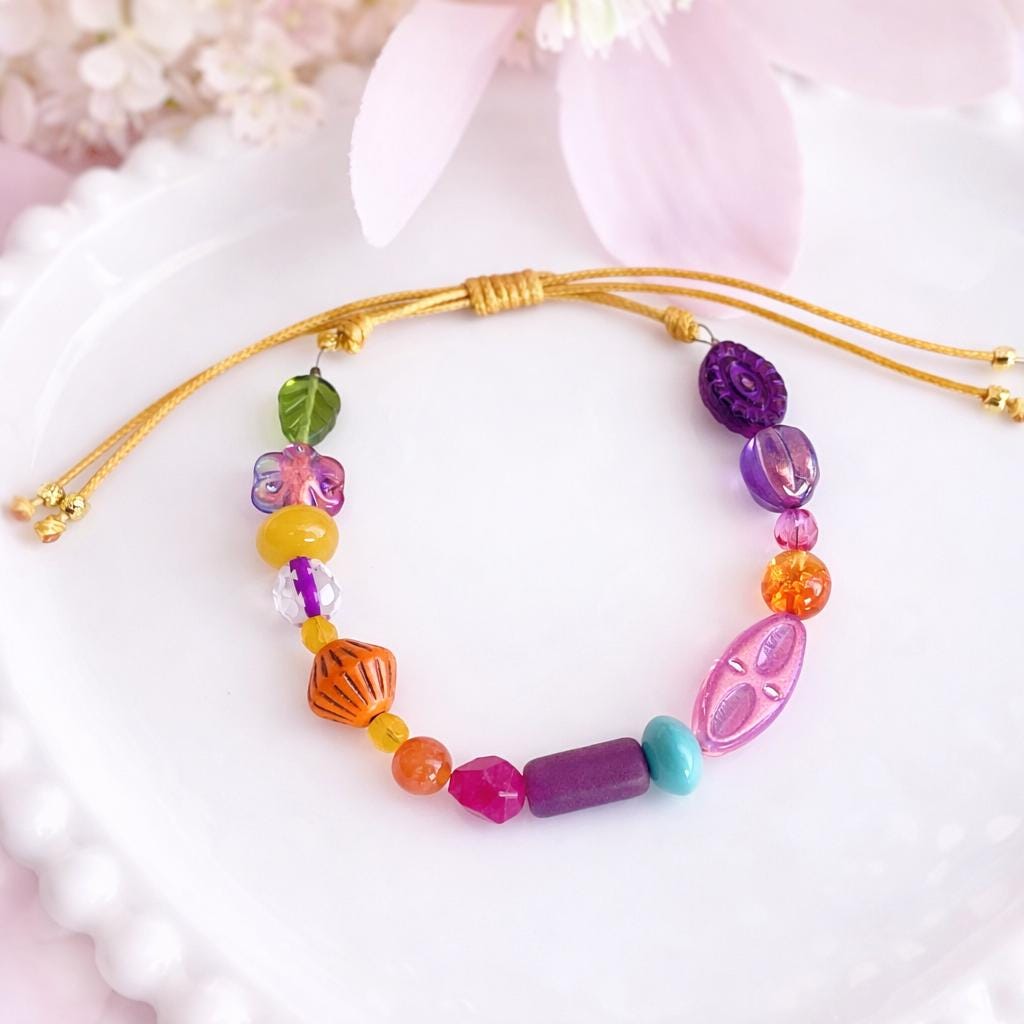 Chaque bracelet est monté à la main avec soin, perle par perle, pour créer une pièce lumineuse et joyeuse.