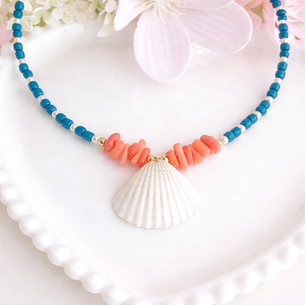 Collier coquillages – Vibe bord de mer – Perles bleu profond et blanc – Bijou été fait main