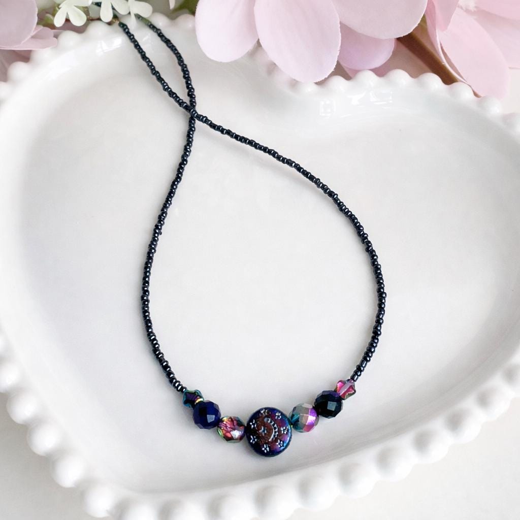 Leur style bohème chic mélange des tons profonds de bleu, violet et irisés, avec des détails délicats qui rappellent la lumière lunaire. Chaque mouvement fait danser les perles et reflète la lumière avec élégance, pour un effet à la fois raffiné et enchanteur.