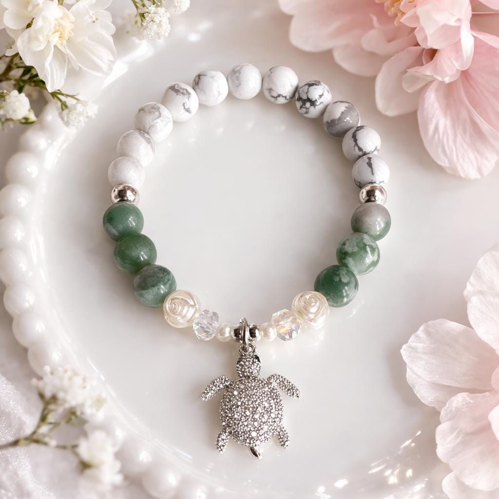 Ce bracelet délicat est composé de Jaspe Peace et de Howlite, des pierres reconnues pour leur énergie douce et apaisante.